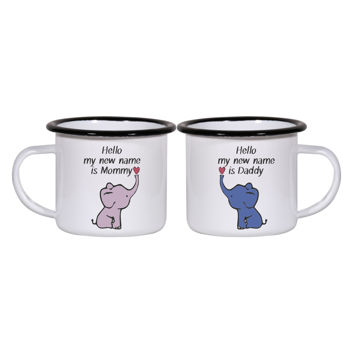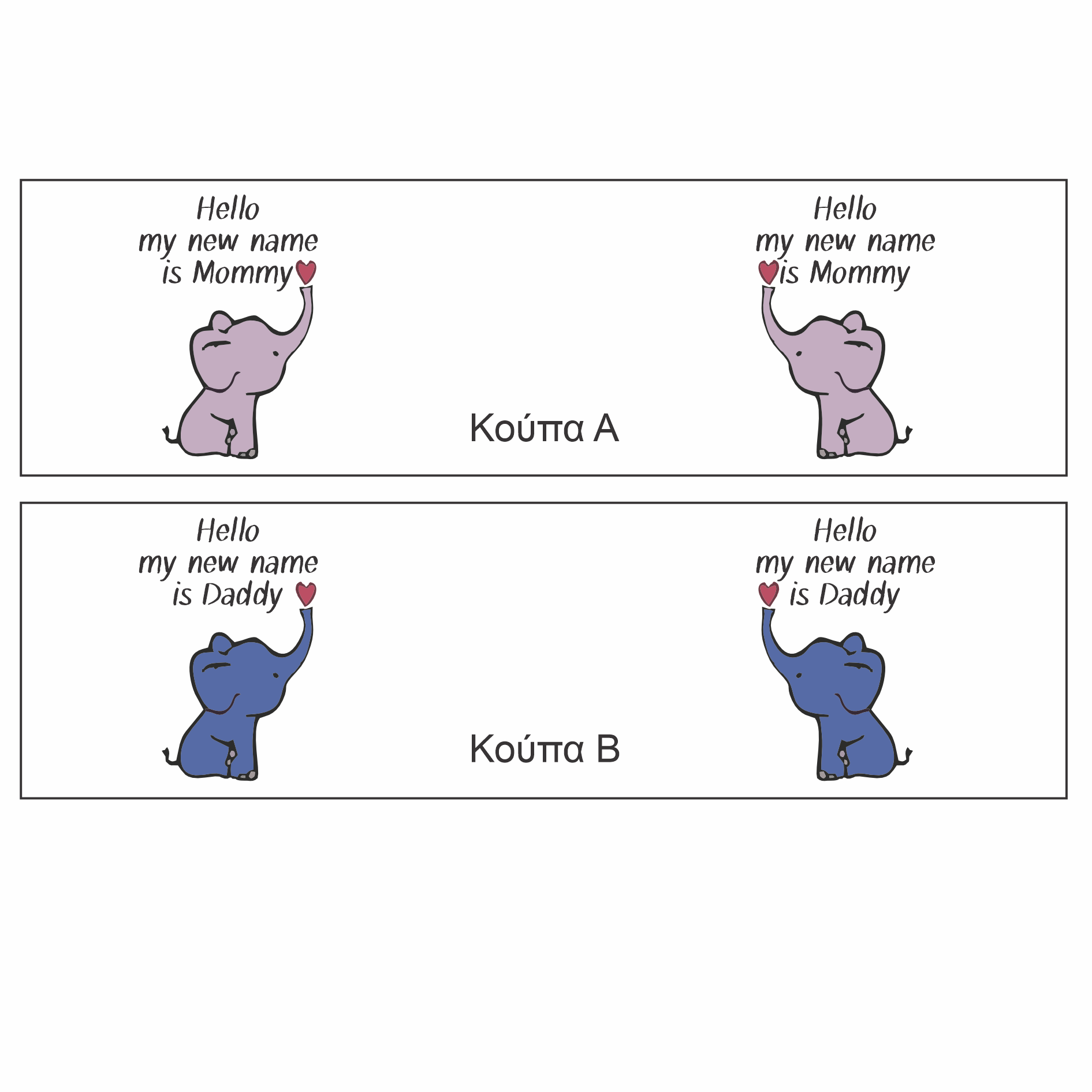 Δύο χαριτωμένα ελεφαντάκια κρατούν τις κούπες: το ένα λέει “Hello, my name is Mommy”, το άλλο “Hello, my name is Daddy”.